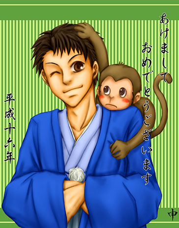 『年賀イラスト(オリジナル)』 by.胡瓜さま カフェスタで仲良くして頂いている 胡瓜さんからお年賀イラをいただきました〜v 少年も可愛いけど、猿も可愛い〜vvv 質感ある彩色はうりたんならではの 「うりたん塗り」!! 今年もよろしくお願いしますv