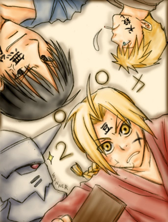 『年賀イラスト(鋼の錬金術師)』 by.胡瓜さま うりたんからのお年賀イラ第3弾! ハガレンですっv 大佐ですっ!! アルちゃんですっ! (いや、他の2人も好きですけど) 顔の墨は、きっと嫌いな単語…ね。 でも。「犬殺し」って…(T_T) そりゃ、食べるとは言ってたけど…(笑) 大佐の鎖骨に萌え〜〜〜〜っっっ!